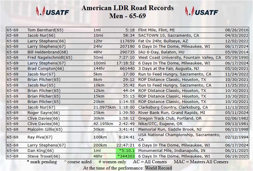I have been working towards this race for the last 2 years. And for me it’s not just the USATF championship, it’s the chance once again try to beat my Age Group (65-69) record, set back in 1990 by Fred Nagalschmidt, 7 hours, 27 minutes and 10 seconds.
